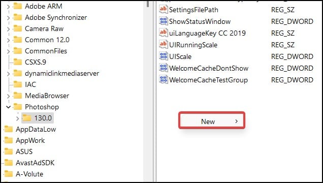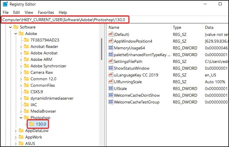 Tekan tombol Windows + R untuk membuka RunKetik regedit dan tekan Enter untuk membuka Registry editorKlik Ya saat diminta oleh Akun Pengguna ControlSekarang, buka Komputer\HKEY_CURRENT_USER \Software\Adobe\Photoshop