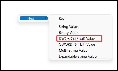 Dari daftar, pilih DWORD(32-bit) Value dan beri nama OverridePhysicalMemoryMB