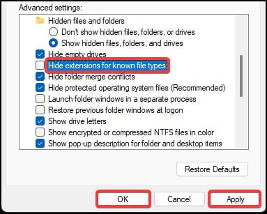 Gulir ke bawah dan hapus centang pada opsi “Sembunyikan ekstensi untuk jenis file yang dikenal”