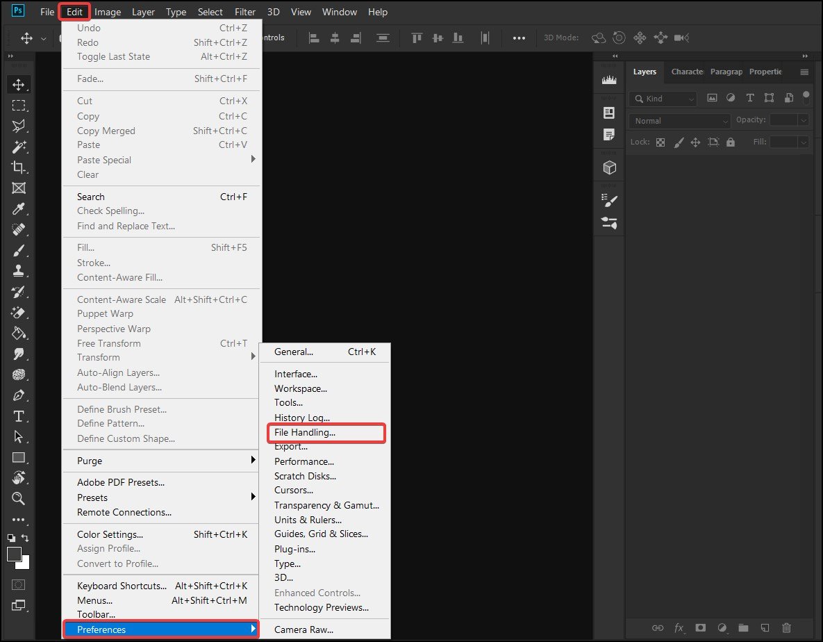 Luncurkan Adobe Photoshop dan klik opsi Edit dari bilah alatBuka Preferensi dan klik Penanganan filePada jendela baru, klik Camera Raw Preferences