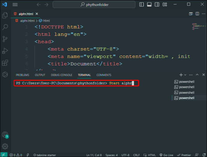 Jika Anda Lebih baik tidak mengutak-atik ekstensi dulu, Terminal di VS Code memungkinkan Anda menjalankan file HTML tanpa ekstensi, meskipun ini sedikit lebih rumit: