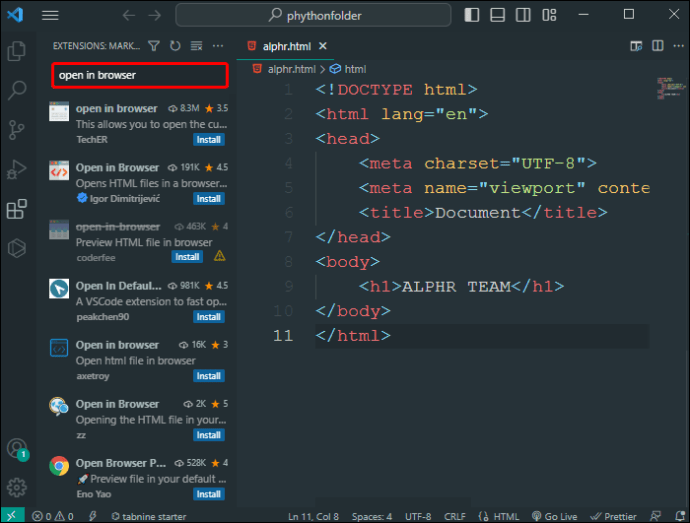 Kembali ke ekstensi, ekstensi berguna lainnya untuk HTML dan web development secara umum adalah “Buka di browser”, yang membuka file HTML di browser web langsung dari VS Code. Begini caranya: