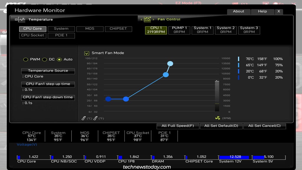 Misalnya, jika Anda melakukan overclock, Anda mungkin ingin mengatur semua kipas ke kecepatan penuh. Atau Anda dapat menggunakan Mode Kipas Cerdas untuk merencanakan kurva kipas khusus yang disesuaikan dengan kebiasaan penggunaan Anda.