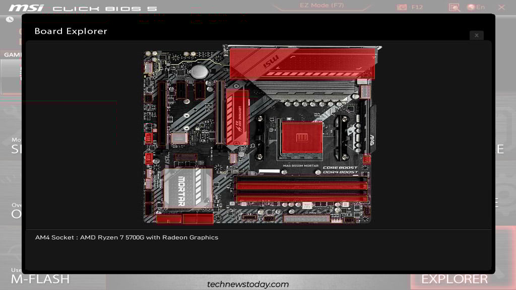 PENGATURAN – Kelola chipset dan pengaturan boot seperti pengaturan PCIe, mode boot, urutan boot, boot aman, dll. OC – Overclocking RAM dan CPU secara manual/otomatis. M-FLASH – utilitas pembaruan BIOS. PROFIL OC – Kelola profil overclocking. MONITOR PERANGKAT KERAS – Mengontrol kecepatan kipas dan memantau suhu dan voltase sistem. BOARD EXPLORER – Alat interaktif untuk mengidentifikasi komponen yang terpasang di board Anda.