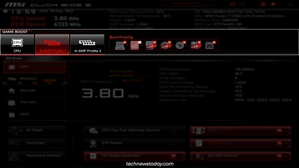 Di baris berikutnya, Anda dapat mengaktifkan Game Boost atau memilih profil XMP dari kiri. Dan Anda dapat mengubah Urutan Booting dari kanan.