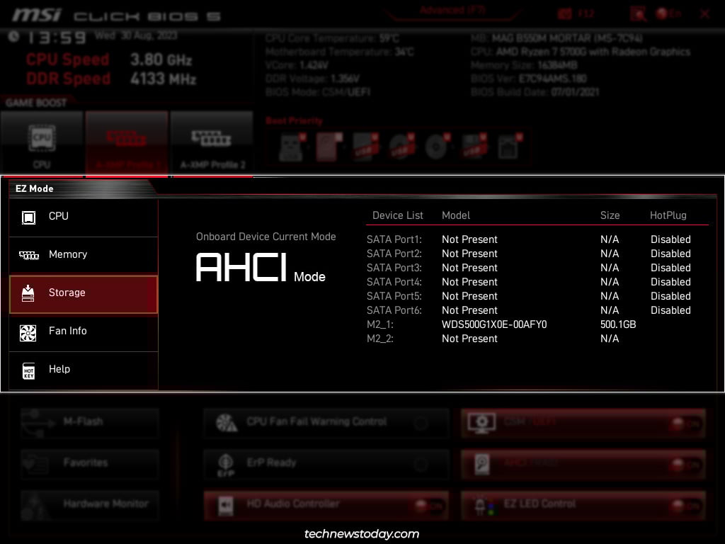 Selain itu, Anda juga akan menemukan info sistem seperti perangkat SATA atau M.2 yang terhubung, versi BIOS, dan tanggal pembuatan , total memori terpasang, dll., dari tab ini.