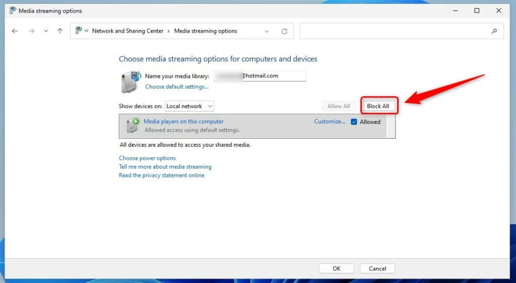 Jika Anda ingin menonaktifkan Media streaming di Windows, 11, cukup navigasikan ke jalur di atas dan klik klik tombol yang bertuliskan “Blokir Semua“seperti yang disorot di bawah.