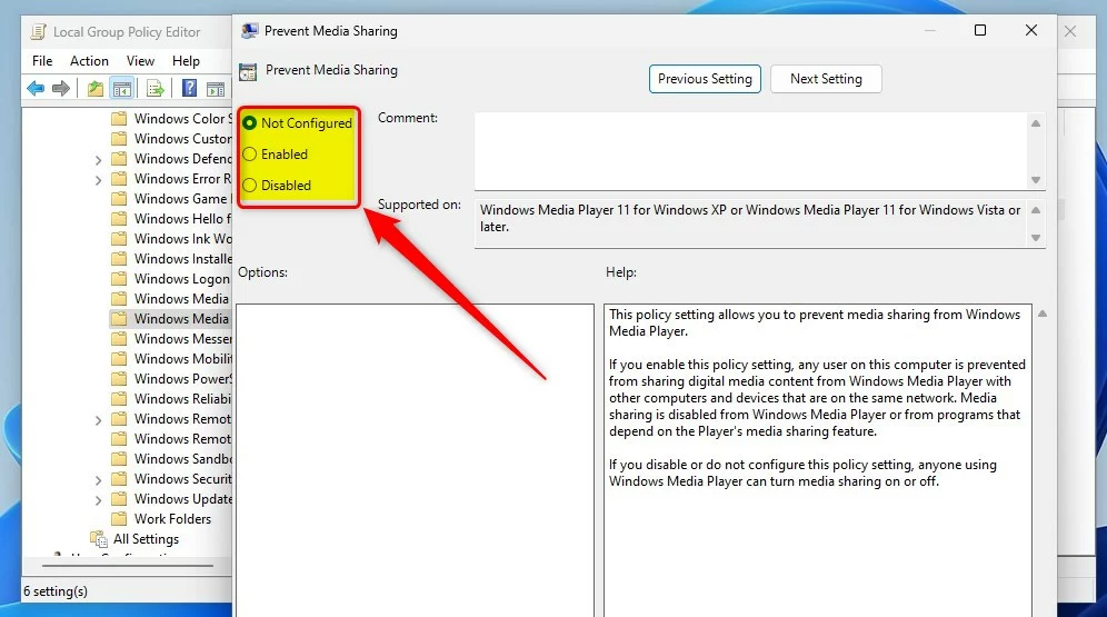 Not Configured ( default)Diaktifkan DinonaktifkanWindows 11 mencegah opsi berbagi media di editor kebijakan grup lokal
