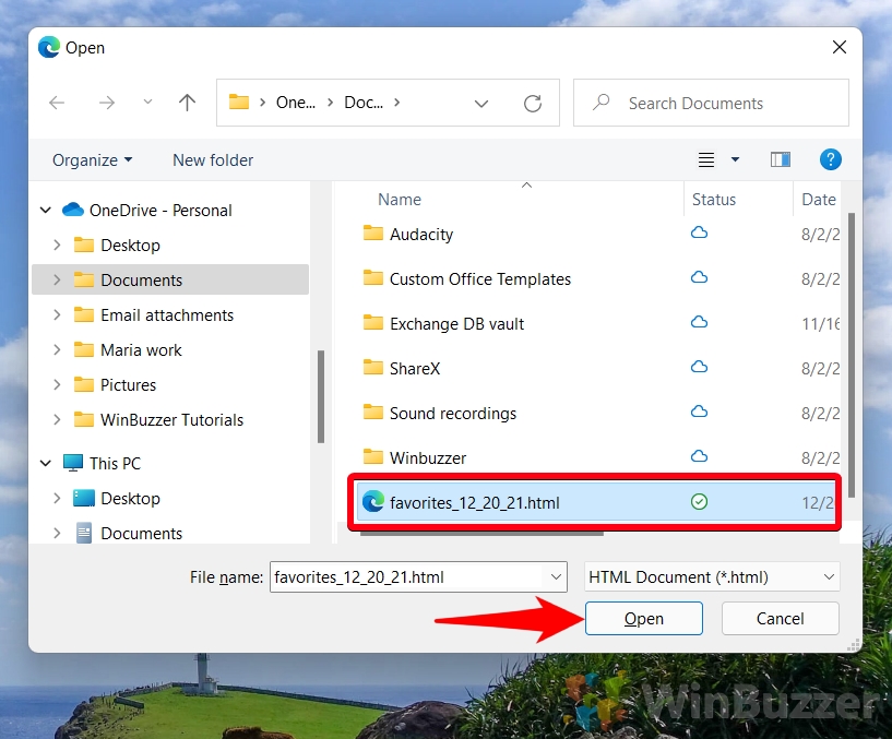 Pilih file cadangan favorit Edge dan klik “Buka”