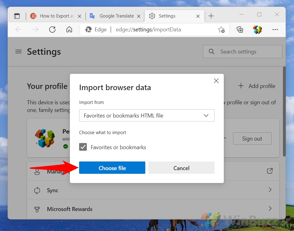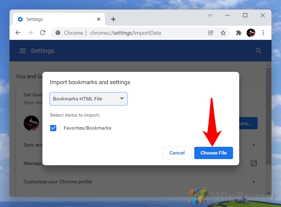 Klik “Pilih file”saat menggunakan file cadangan bookmark browser