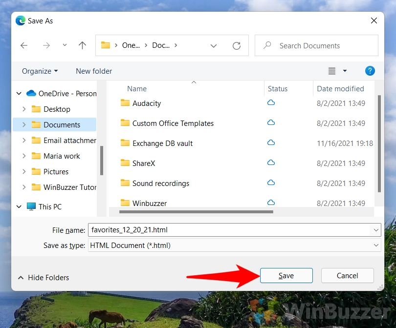 Pilih nama file dan tujuan untuk cadangan Edge Favorites Anda dan klik “Oke”