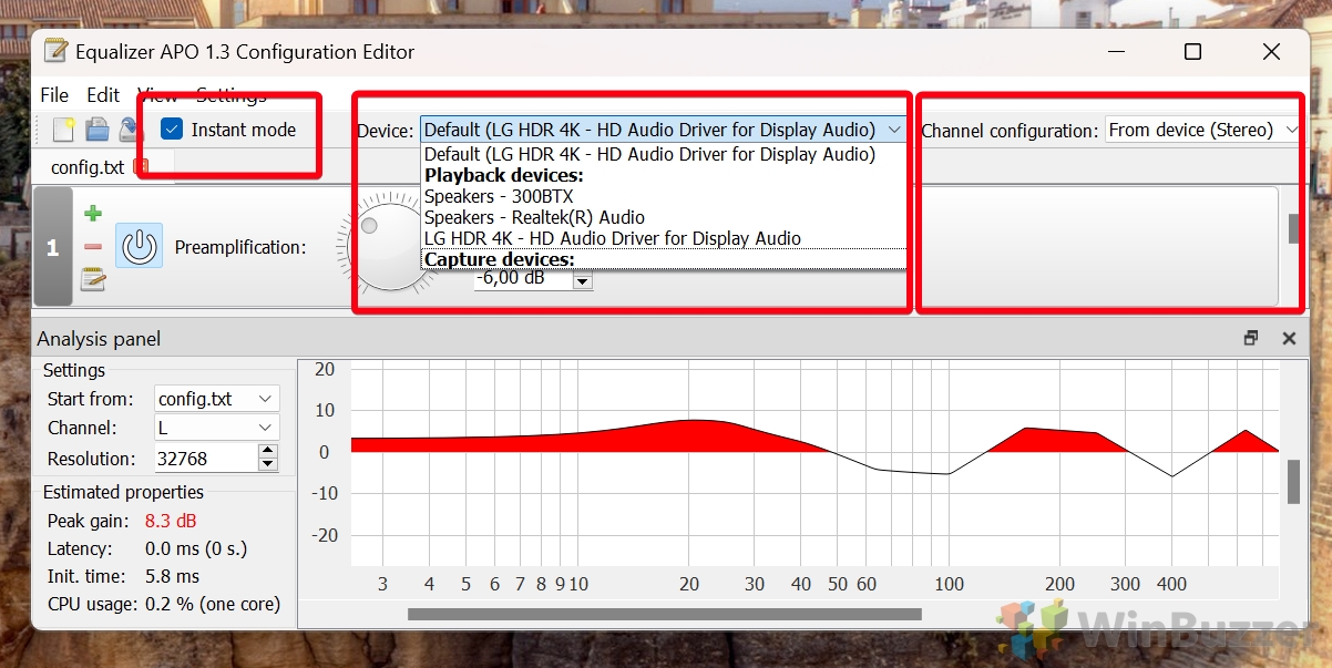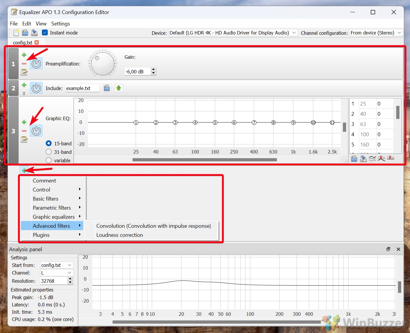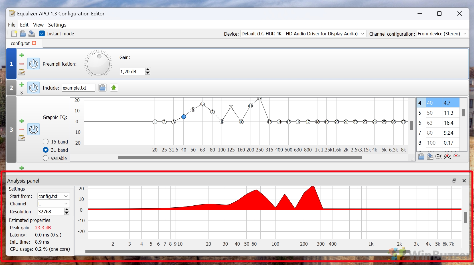 Panel Analisis di Equalizer APO memberikan masukan visual pada sinyal audio yang sedang diproses. Biasanya menampilkan informasi seperti spektrum frekuensi, yang menampilkan kekuatan berbagai frekuensi dalam audio. Hal ini memungkinkan Anda melihat dampak pengaturan pemerataan secara real-time, sehingga lebih mudah untuk mengidentifikasi dan menyesuaikan frekuensi tertentu yang mungkin perlu ditingkatkan atau dikurangi. Selain itu, ini dapat menampilkan parameter lain seperti fase dan penundaan, sehingga menawarkan wawasan tentang karakteristik audio yang dapat menginformasikan pilihan pemerataan Anda.