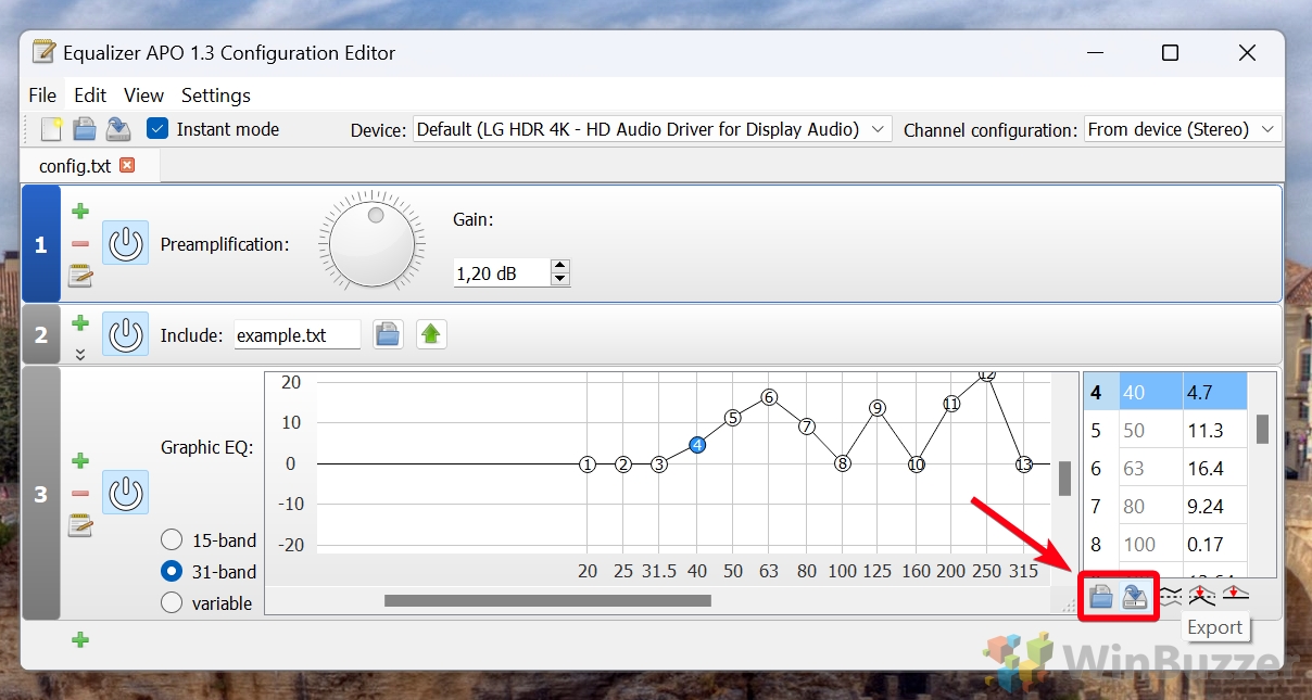 Anda dapat menyimpan preset equalizer pribadi sebagai file.txt dan mengimpornya nanti jika diperlukan. Dengan menggunakan Google, Anda dapat menemukan preset yang dioptimalkan untuk perangkat audio tertentu seperti headphone, speaker, dan jenis musik dari pengguna lain. Cara yang lebih nyaman untuk menggunakan Equalizer APO adalah plugin yang menawarkan antarmuka terpisah, seperti Peace Equalizer (lihat bagian selanjutnya).