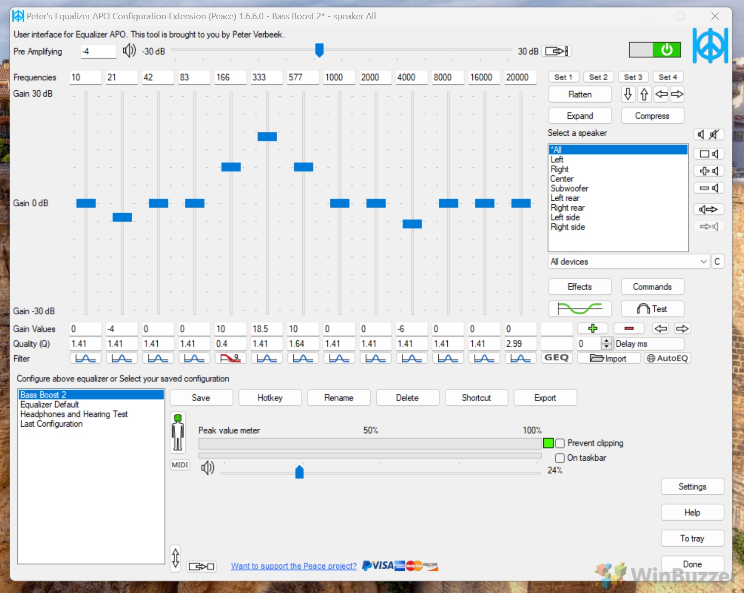 Di Peace Equalizer atau Equalizer APO, sesuaikan penggeser atau filter sesuai keinginan Anda, lalu simpan setelan ini sebagai prasetel baru untuk digunakan di masa mendatang.