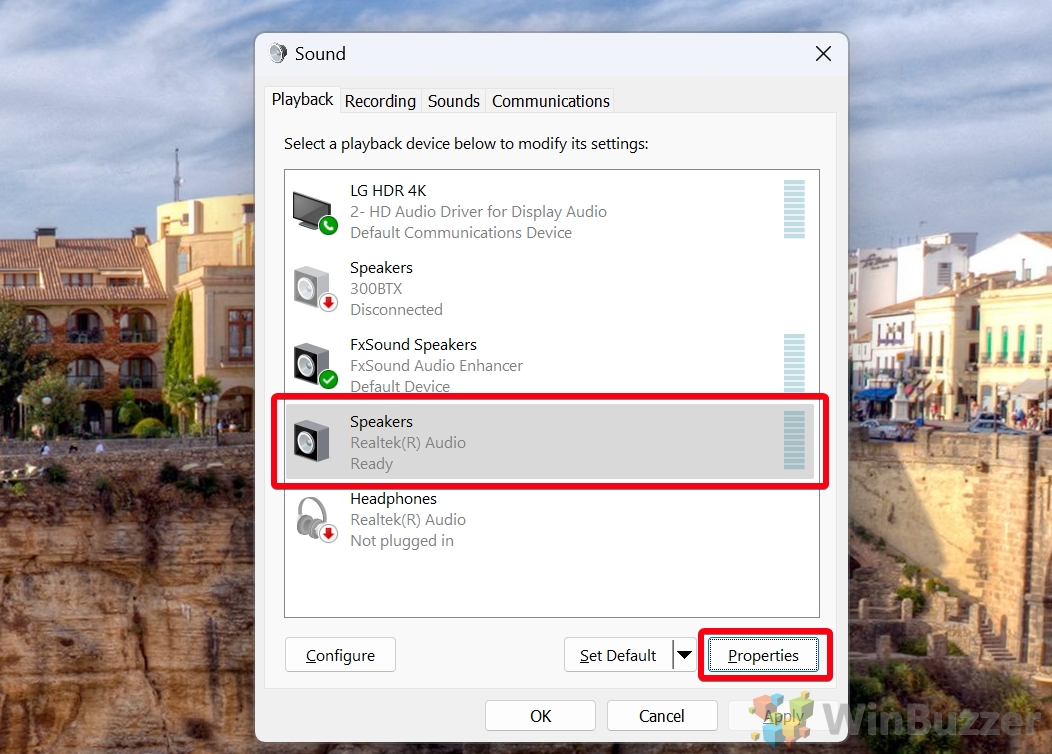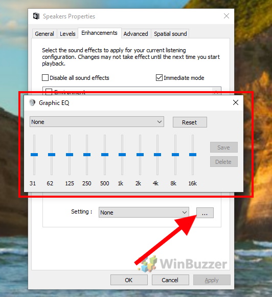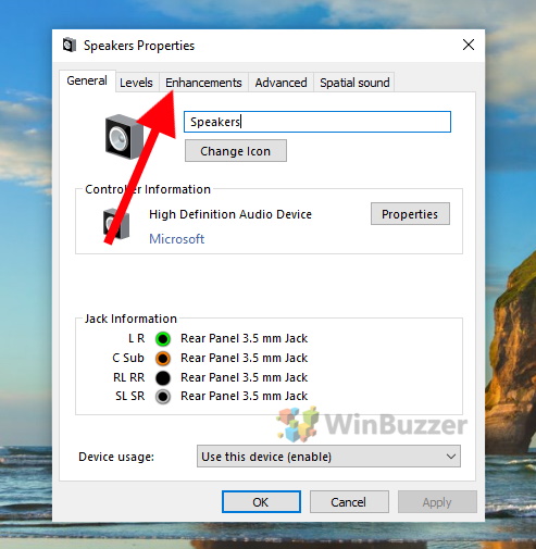 “Properti Speaker” mungkin terlihat berbeda, bergantung pada chipset audio Anda. Jika tab “Penyempurnaan” tidak ada, Anda mungkin tidak dapat menggunakan Equalizer bawaan dan harus menggunakan salah satu opsi lain yang ditampilkan di bawah.