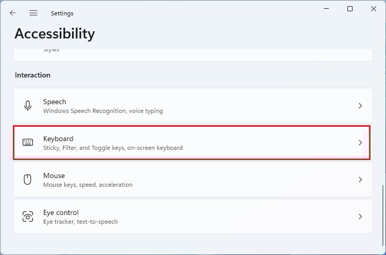 Di sini, pindah ke tab Aksesibilitas dan pilih Keyboard dari bagian Interaksi.