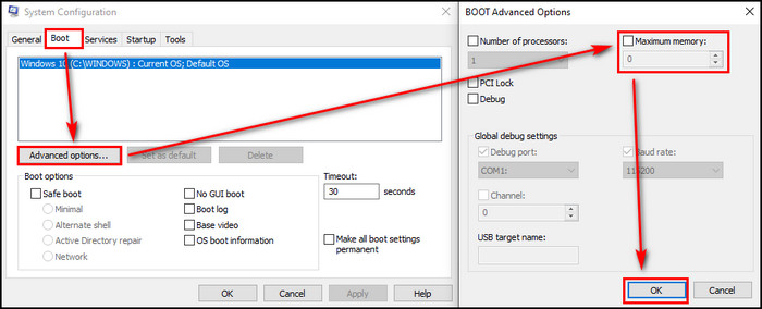 Buka kotak dialog RUN dengan menekan tombol Windows + R bersamaan. Ketik msconfig dan tekan Enter. Beralih ke Boot tab dari jendela Konfigurasi Sistem .Klik Opsi lanjutan.Hapus centang Memori maksimum.Klik Simpan untuk menyimpan perubahan.
