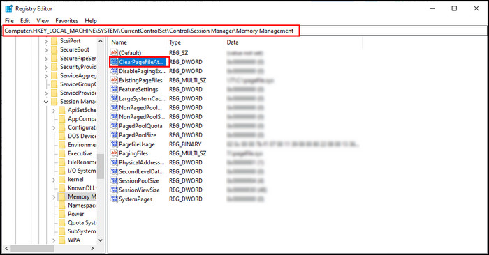 Buka tombol RUN kotak dialog dengan menekan tombol Windows + R bersamaan. Ketik regedit dan tekan Enter. Navigasi ke HKEY_LOCAL_MACHINE > Sistem > CurrentControlSet > Control > Session Manager > Memory Management dari menu sebelah kiri. Cari ClearPageFileAtShutdown dari tabel sebelah kanan.