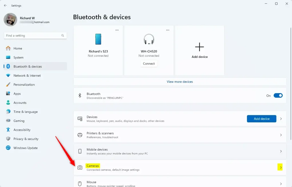 Pilih ubin Kamera di bawah’Bluetooth & perangkat’ di sebelah kanan untuk meluaskannya.