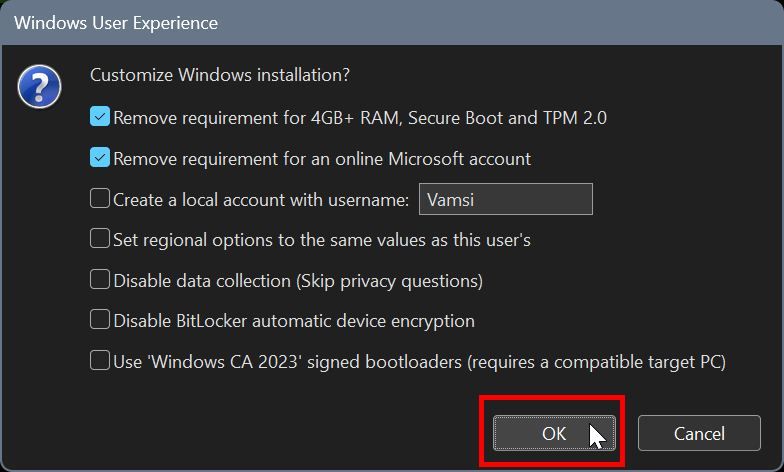 Segera setelah Anda melakukannya, Anda akan melihat dialog “Pengalaman Pengguna Windows“. Di sini, Anda dapat memilih opsi untuk menyesuaikan instalasi Windows 11. Misalnya, Anda dapat membuat Rufus secara otomatis membuat akun pengguna lokal dengan memilih kotak centang “Buat akun pengguna lokal dengan nama pengguna”.