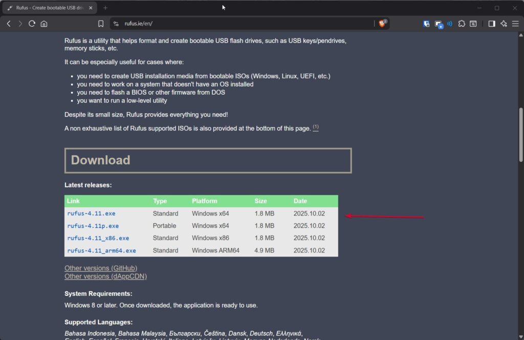 Flash Drive USB (8 GB atau lebih): Ini akan terhapus seluruhnya, jadi buat cadangan apa pun yang penting di dalamnya terlebih dahulu. Komputer yang Bekerja dengan Akses Internet: Anda akan menggunakan ini untuk mengunduh file dan menyiapkan USB. File ISO atau Alat Pengaturan Windows 11 25H2: Kami akan menunjukkan dua cara aman untuk mendapatkannya. Salah satu dari Dua Program untuk membuat USB yang dapat di-boot: Alat Pembuatan Media Microsoft Rufus adalah program kecil gratis untuk membuat drive yang dapat di-boot.