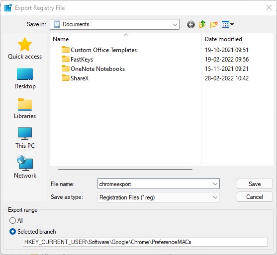 Tekan “tombol Windows + R“untuk membuka Run. Ketik “regedit“dan tekan Enter. Buka folder “HKEY_CURRENT_USER\Software\Google\Chrome\PreferenceMACs“.Klik kanan pada folder Folder “PreferenceMACs“. Pilih opsi “Ekspor“. Silakan beri nama dan simpan file.reg di drive USB.Cabut drive USB.