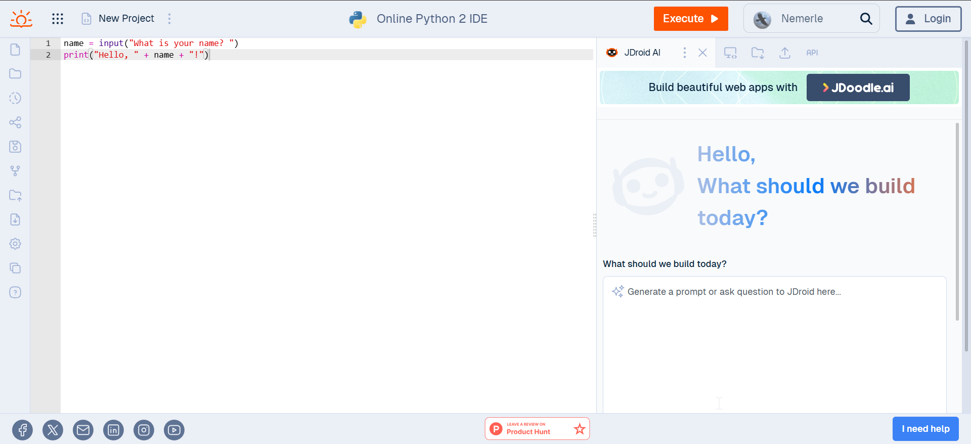 name=input(“Siapa nama Anda?”) print(“Halo,”+ nama +”!”)
