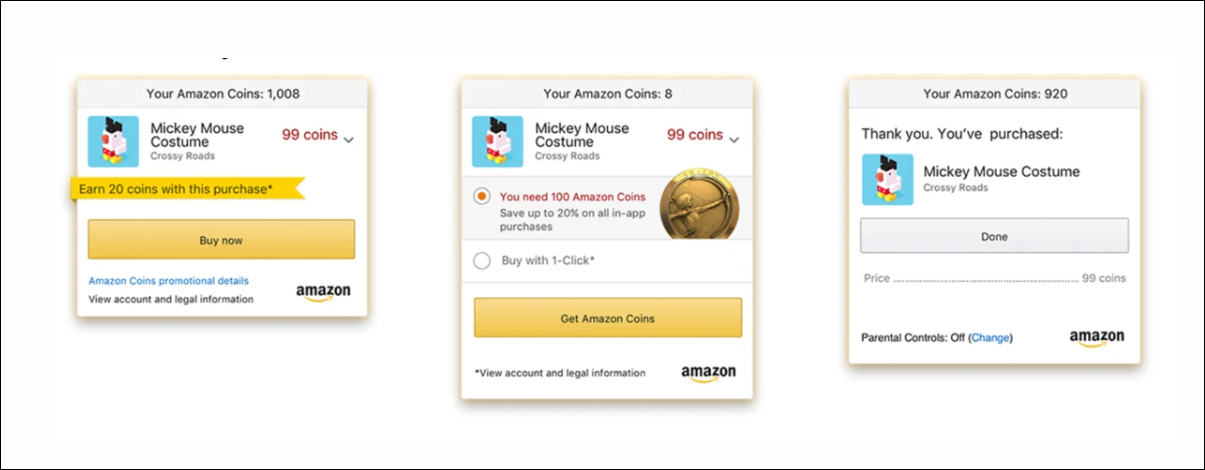 Untuk membeli Koin, pengguna mengunjungi Amazon Appstore atau halaman pembelian Amazon Coins di desktop atau seluler. Paket dimulai dari 300 Koin dan meningkat menjadi 50.000 Koin, dengan diskon meningkat di tingkat yang lebih tinggi. Misalnya, diskon 10% diterapkan saat membeli 10.000 Koin dibandingkan dengan nilai dasar.