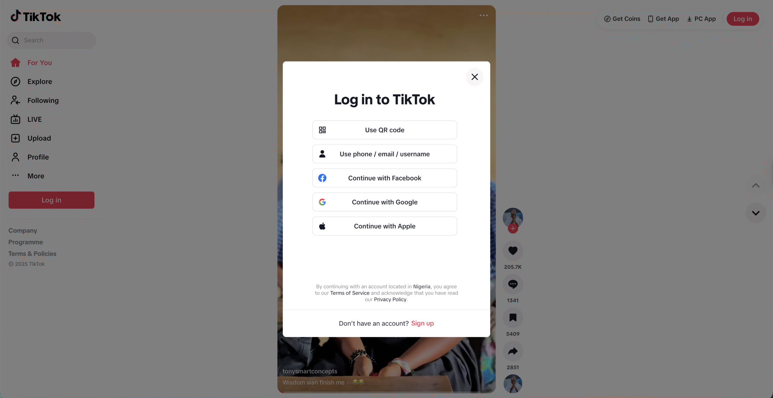 Buka browser modern seperti Microsoft Edge, Google Chrome, Firefox, atau Opera di PC Anda. Ketik alamat resmi TikTok dan tekan Enter, atau gunakan mesin pencari seperti Google untuk menemukannya. Klik tombol Masuk di pojok kanan atas. Masuk dengan akun yang sama dengan yang Anda gunakan di ponsel, menggunakan email, nama pengguna, atau opsi lain yang didukung. Setelah login, gunakan sidebar kiri untuk beralih antara Untuk Anda, Mengikuti, Kotak Masuk, dan Profil.