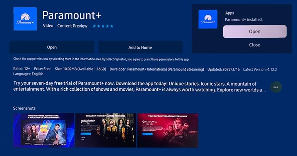 Tekan Beranda di remote Samsung Anda dan buka bagian Aplikasi. Gunakan bilah pencarian untuk mencari Paramount+ atau Paramount+ dengan Showtime. Selanjutnya, pilih aplikasinya dan pilih Instal, lalu tunggu hingga pengunduhan selesai. Saat tombol berubah, pilih Buka untuk meluncurkannya.