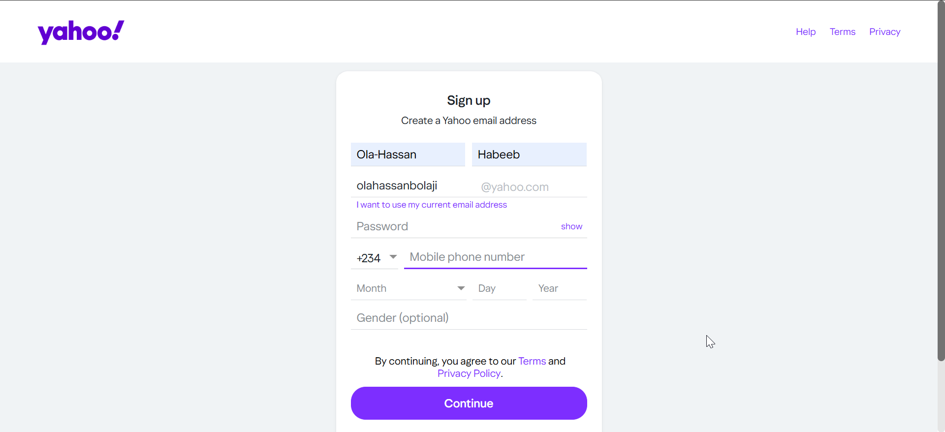 Cukup luncurkan browser Anda dan buka halaman pendaftaran Yahoo. Selanjutnya, masukkan nama, nama pengguna, dan kata sandi Anda. Sekarang, tambahkan nomor ponsel Anda dan verifikasi kode SMS.