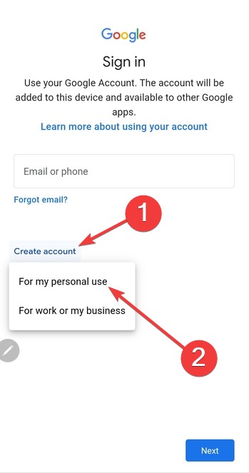 Jika Anda ingin menggunakan aplikasi Gmail, buka aplikasi dan ketuk Tambahkan akun. Selanjutnya, pilih Google dan ketuk Buat akun. Sekarang, pilih Untuk penggunaan pribadi, masukkan detail Anda, dan verifikasi nomor telepon Anda.