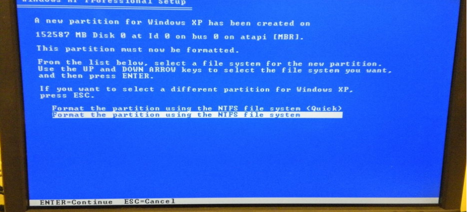 Pilih drive target dan buat partisi jika diperlukan. Formatlah sebagai NTFS agar Windows XP dapat diinstal dengan benar dan menyimpan file secara efisien.