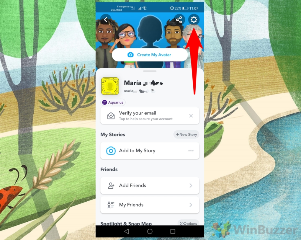 Ketuk ikon “Pengaturan”di pojok kanan atas untuk membuka pengaturan Snapchat