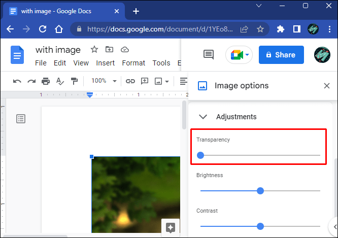 Google Docs adalah aplikasi berbasis cloud lainnya dengan fitur pengeditan foto yang terbatas. Penyesuaian transparansi gambar dimungkinkan dan memerlukan proses yang sangat sederhana.