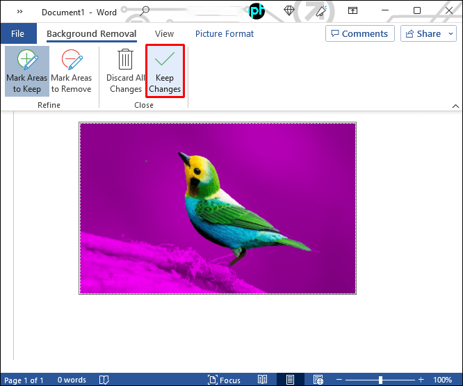 Word melakukannya dengan mencoba mengisi latar belakang gambar dalam warna magenta. Setelah itu, Anda dapat memilih apa yang terjadi dengan latar belakang yang diisi.