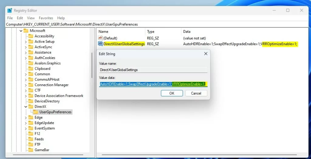 Windows UserGpuPreferences Variable Refresh Rate string value