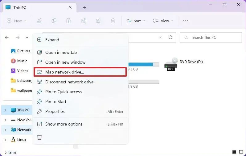 Klik kanan pada Jaringan dari panel kiri dan pilih opsi”Petakan drive jaringan”.