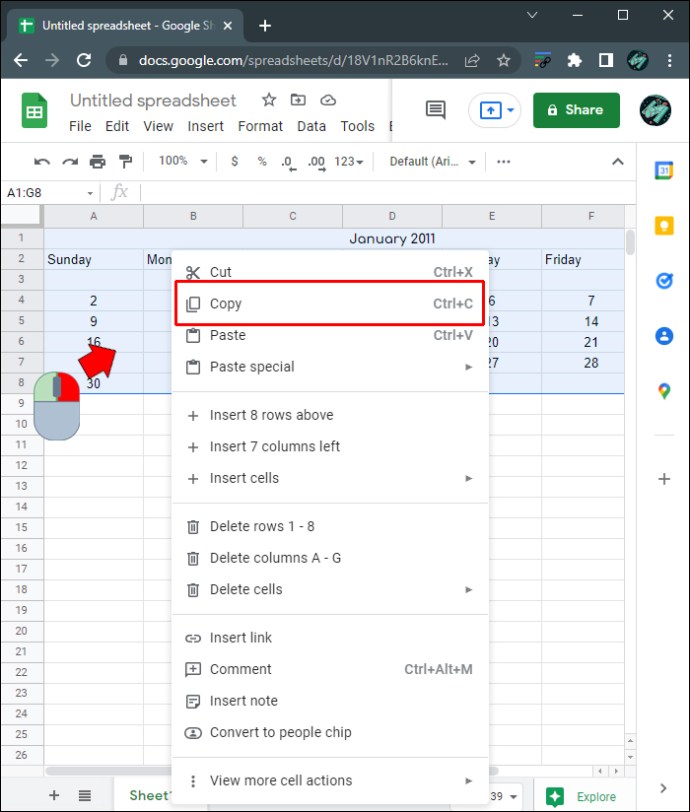 Setelah selesai, Anda dapat menyalin dan menempel bulan untuk membuat beberapa bulan, atau cukup menempelkannya ke sheet baru untuk membuat bulan terpisah. Untuk melakukan ini, klik dan seret mouse Anda untuk memilih seluruh kalender lalu klik kanan. Pada menu munculan pilih “Salin.”