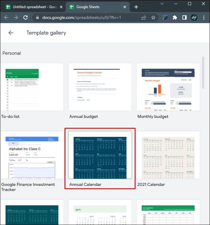Ada ada beberapa desain template yang bisa dipilih. Jika Anda ingin menggunakan template kalender dinamis, pilih “Kalender Tahunan”. Google Spreadsheet akan memuat template kalender.