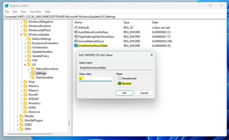 Klik dua kali nama item kunci baru (SmartActiveHoursState) dan pastikan opsi Base adalah Desimal, lalu perbarui Nilai data, pastikan Anda mempertahankan nilai yang ada: