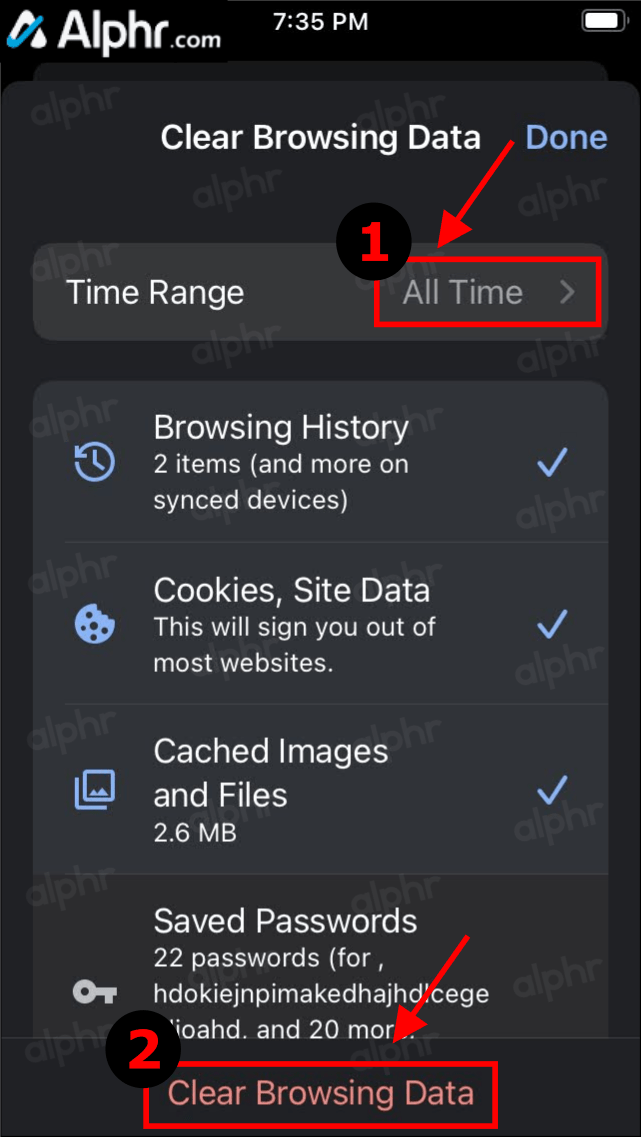 Pilih rentang waktu, lalu hapus centang data apa pun yang ingin Anda pertahankan, seperti “Cookie, Data Situs,” “Cache Gambar”, dll., lalu pilih “Hapus data Browsing.”Konfirmasi tindakan dengan mengetuk “Hapus Data Penjelajahan” sekali lagi.