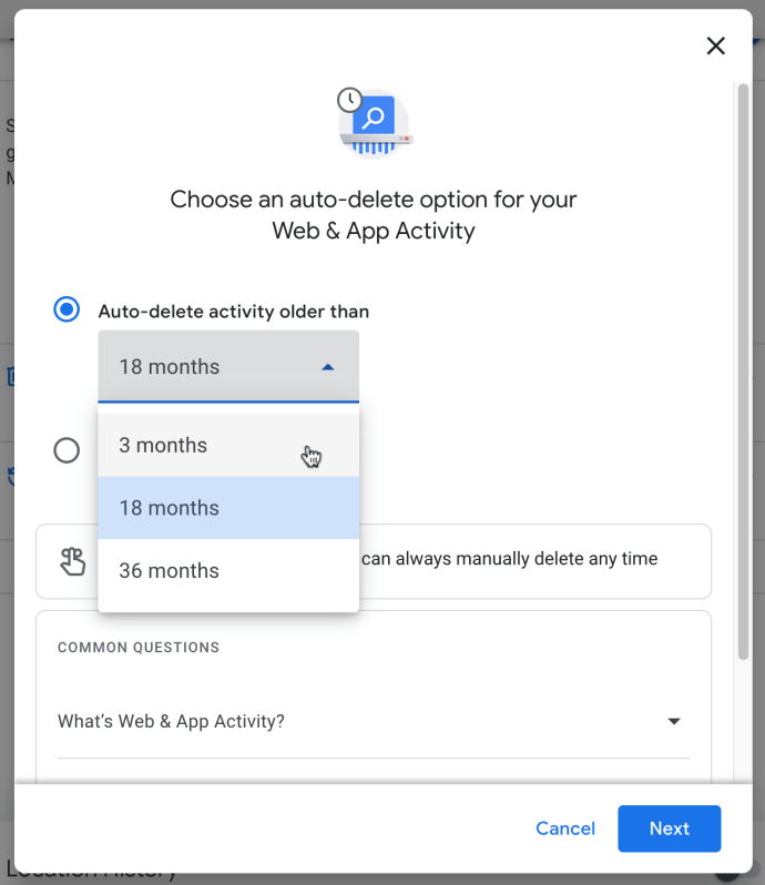 Klik menu tarik-turun “Hapus otomatis aktivitas yang lebih lama dari” dan pilih “ 3 bulan”, “18 bulan,“atau “36 bulan,“, lalu klik “Berikutnya.“
