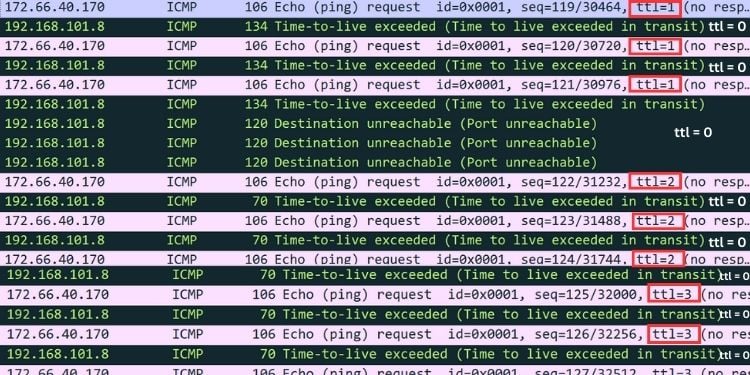 Traceroute utilizza valori di Time-To-Live (TTL) che diminuire (di 1) ogni volta che i pacchetti raggiungono un hop. Quando il valore è 0, quel router/gateway risponde con un pacchetto di risposta ICMP.