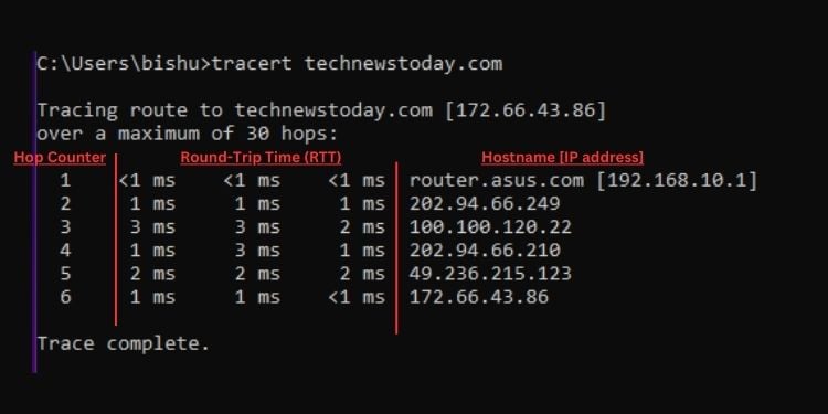 Dopo aver eseguito il comando tracert su Windows, il round-viene visualizzato il tempo di viaggio di ogni pacchetto insieme all’indirizzo IP/nome host dell’hop. Analizzando questo output, ora puoi avere un’idea generale di quale hop potrebbe avere problemi.