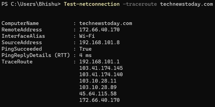 Sebbene lo stesso comando funzioni correttamente nella finestra di Windows Powershell, ecco un cmdlet alternativo per eseguire traceroute: