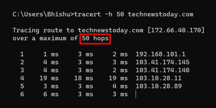 In Windows, il numero massimo predefinito di hop che i pacchetti possono percorrere è 30. Pertanto, una volta che il contatore degli hop raggiunge il limite, i pacchetti vengono eliminati e non è possibile trovare il percorso finale. Ma non devi preoccuparti perché è possibile aumentare questo numero utilizzando un parametro dedicato, di cui parlerò più avanti.