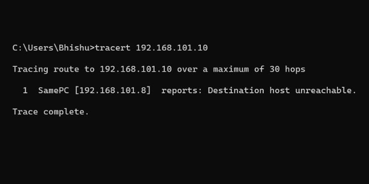 Dopo aver eseguito il comando tracert su Windows, il round-viene visualizzato il tempo di viaggio di ogni pacchetto insieme all’indirizzo IP/nome host dell’hop. Analizzando questo output, ora puoi avere un’idea generale di quale hop potrebbe avere problemi.
