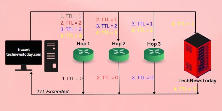 Capiamolo con un semplice esempio. Supponiamo che tu stia cercando di tracciare il percorso del nostro sito, TechNewsToday. Una volta eseguito il comando Traceroute, tre pacchetti ICMP dal tuo dispositivo vengono inoltrati al nostro server con TTL=1.