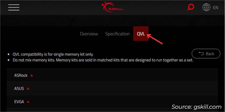 Alcuni produttori affidabili di RA, come G.Skill, includono anche il QVL della scheda madre list (come mostrato di seguito).